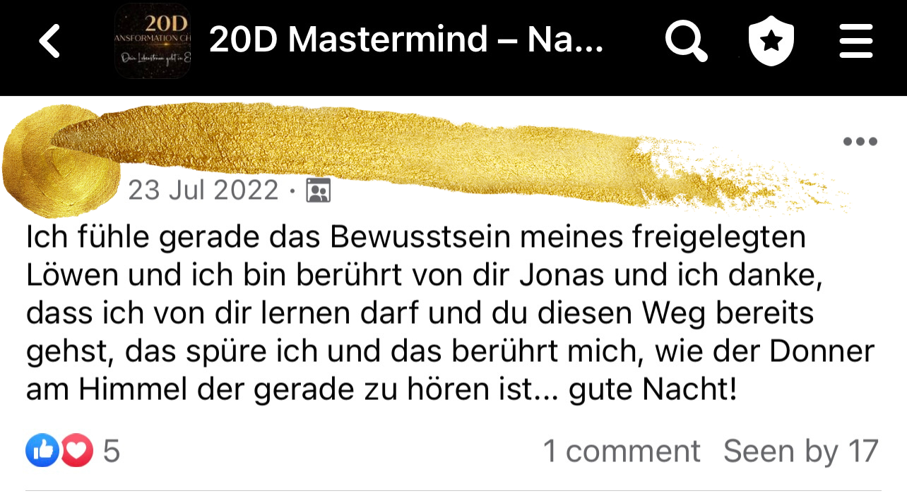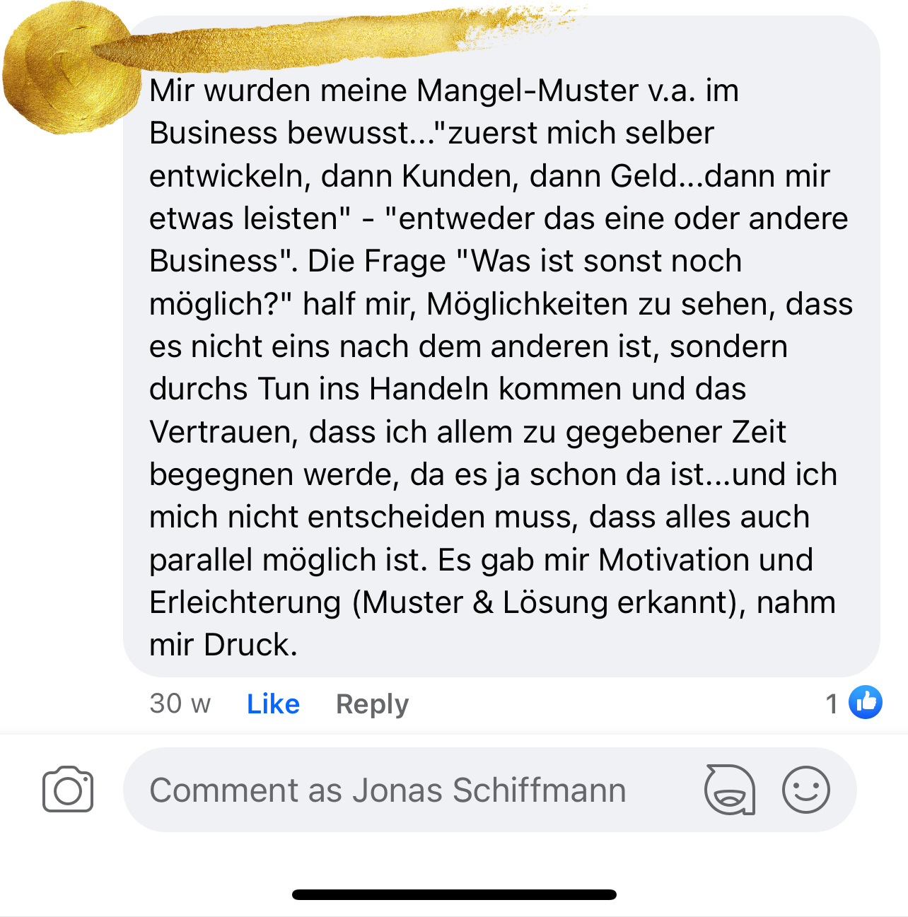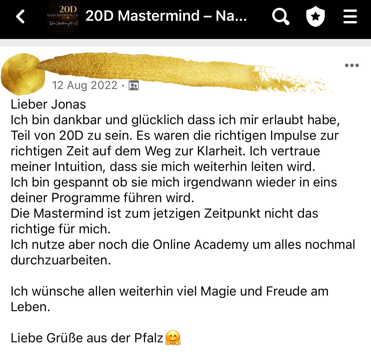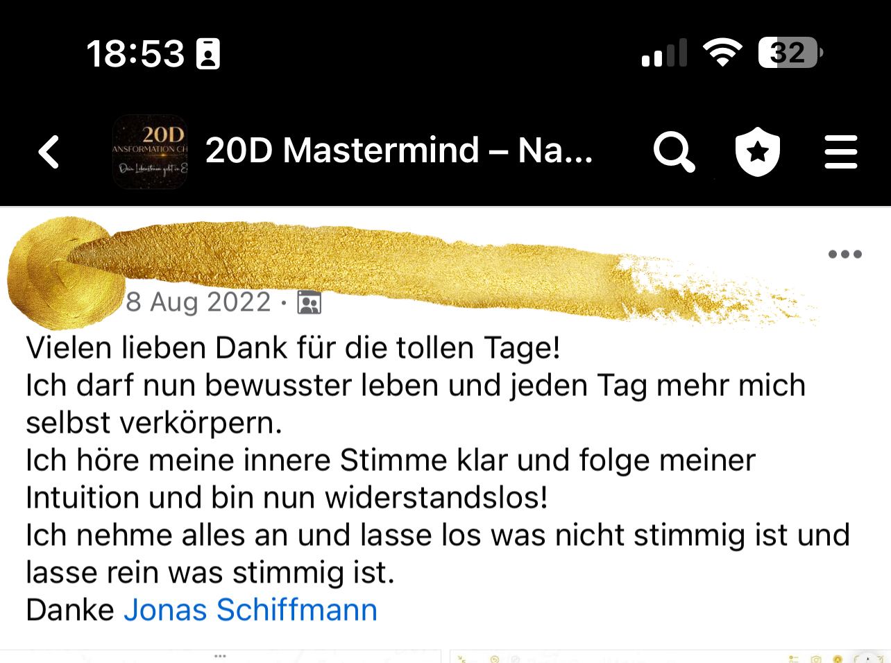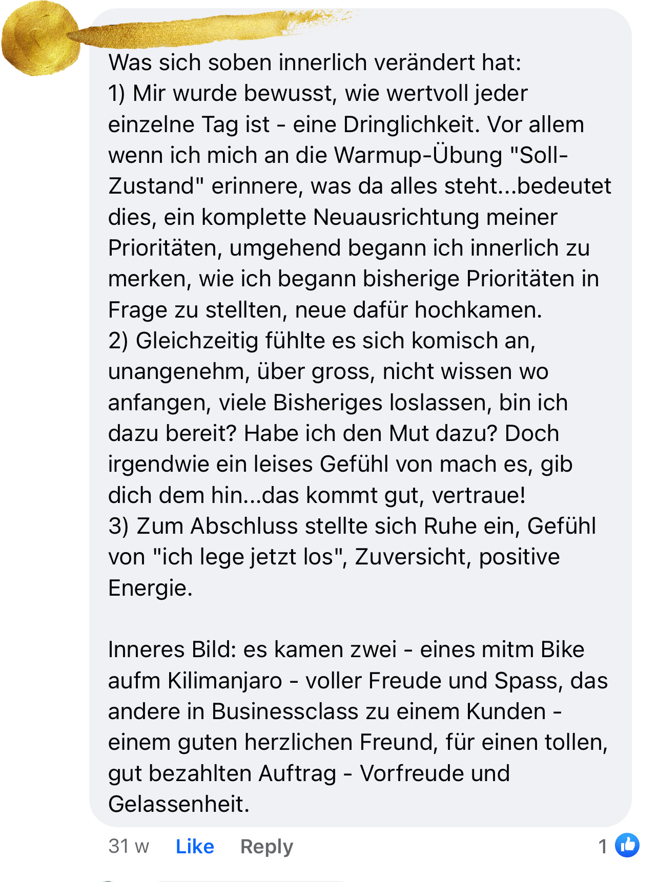 „In nur 20 Tagen intensiver Selbstarbeit habe ich enorm an Selbstvertrauen gewonnen und eine Fülle neuer Business-Ideen entwickelt. Diese Zeit ermöglichte mir, meine Zielgruppe klar zu identifizieren und bedeutende Vergebungsarbeit für meine Vergangenheit zu leisten. Ich habe tiefgehende Einsichten zum Thema Geld gewonnen und lang unterdrückte Emotionen endlich freigesetzt. Das Ergebnis? Direkt nach dem Programm gewann ich meine ersten bezahlten Kunden für mein neues Herzbusiness. Ich bin unendlich dankbar für diese transformative Erfahrung und für den wertvollen Input. Herzlichen Dank! ❤️🔑“