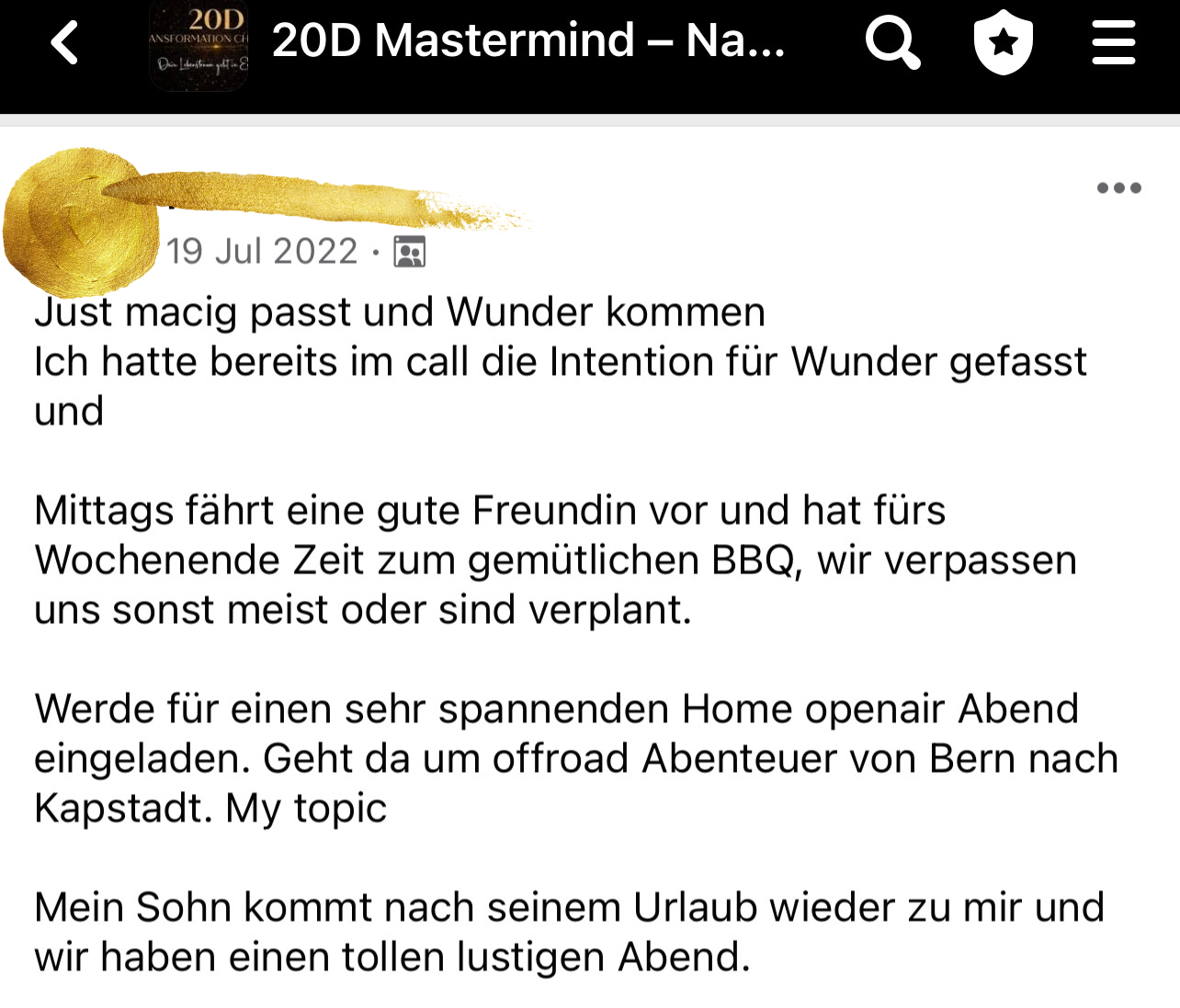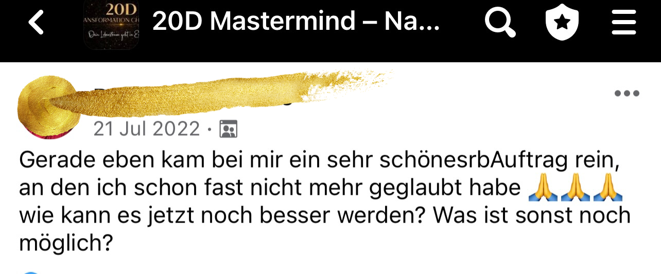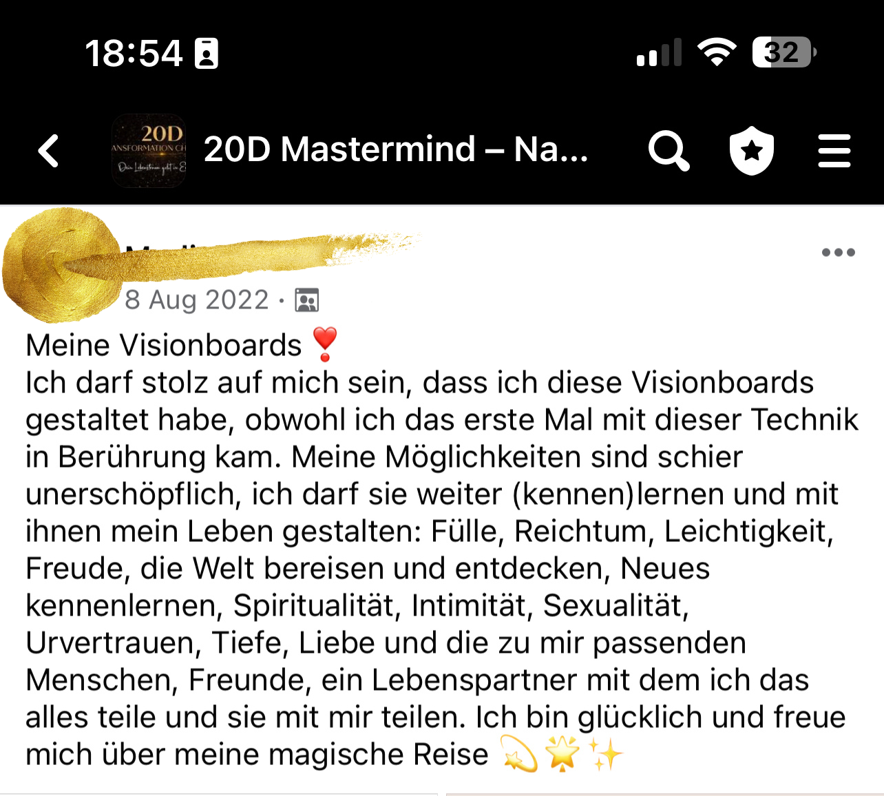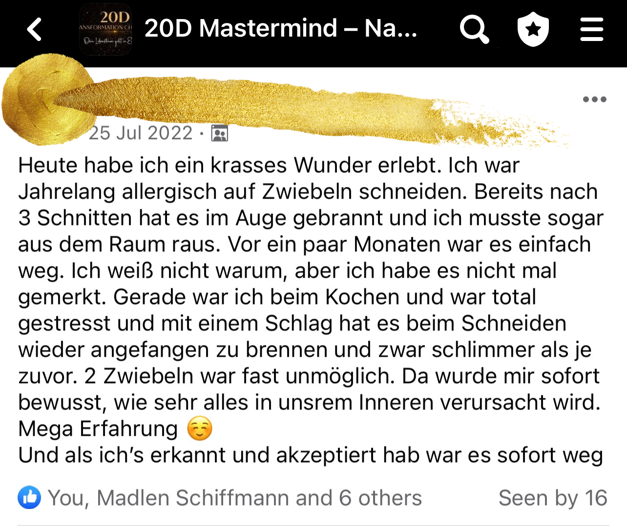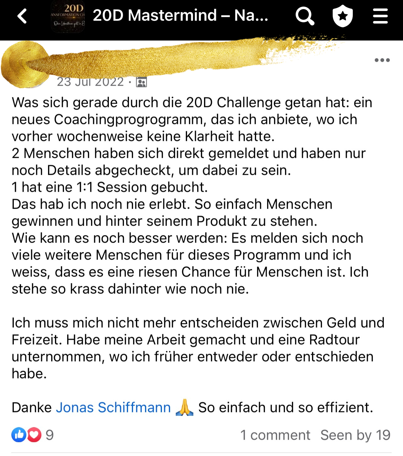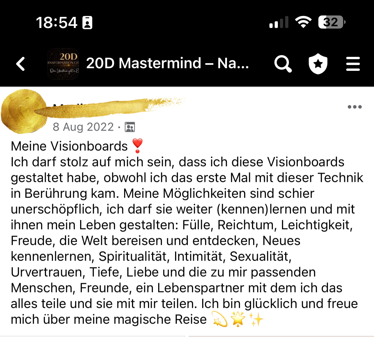 „In nur 20 Tagen intensiver Selbstarbeit habe ich enorm an Selbstvertrauen gewonnen und eine Fülle neuer Business-Ideen entwickelt. Diese Zeit ermöglichte mir, meine Zielgruppe klar zu identifizieren und bedeutende Vergebungsarbeit für meine Vergangenheit zu leisten. Ich habe tiefgehende Einsichten zum Thema Geld gewonnen und lang unterdrückte Emotionen endlich freigesetzt. Das Ergebnis? Direkt nach dem Programm gewann ich meine ersten bezahlten Kunden für mein neues Herzbusiness. Ich bin unendlich dankbar für diese transformative Erfahrung und für den wertvollen Input. Herzlichen Dank! ❤️🔑“