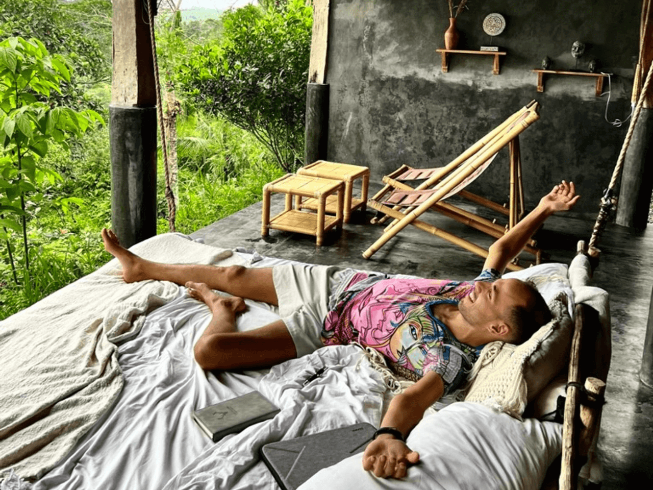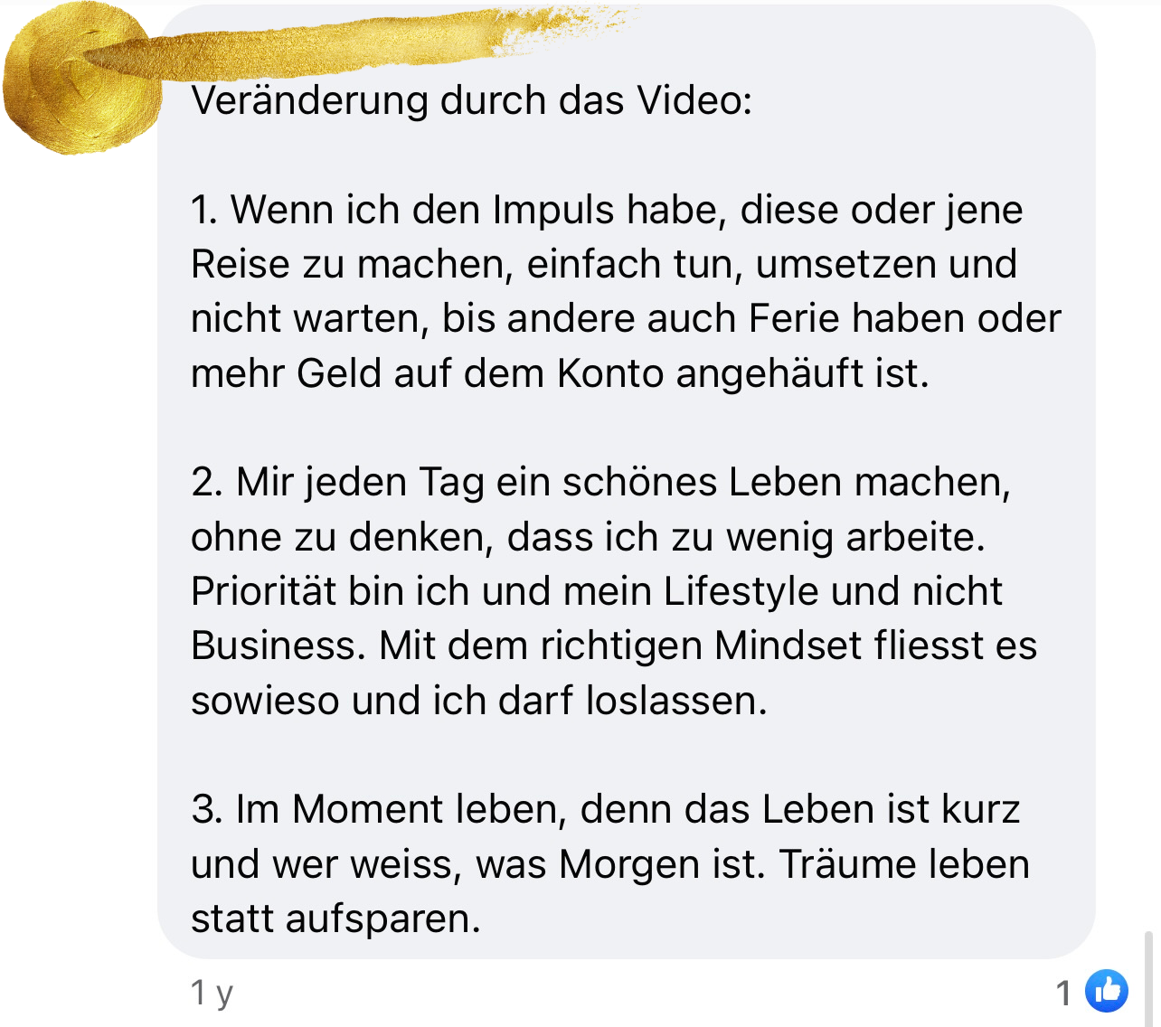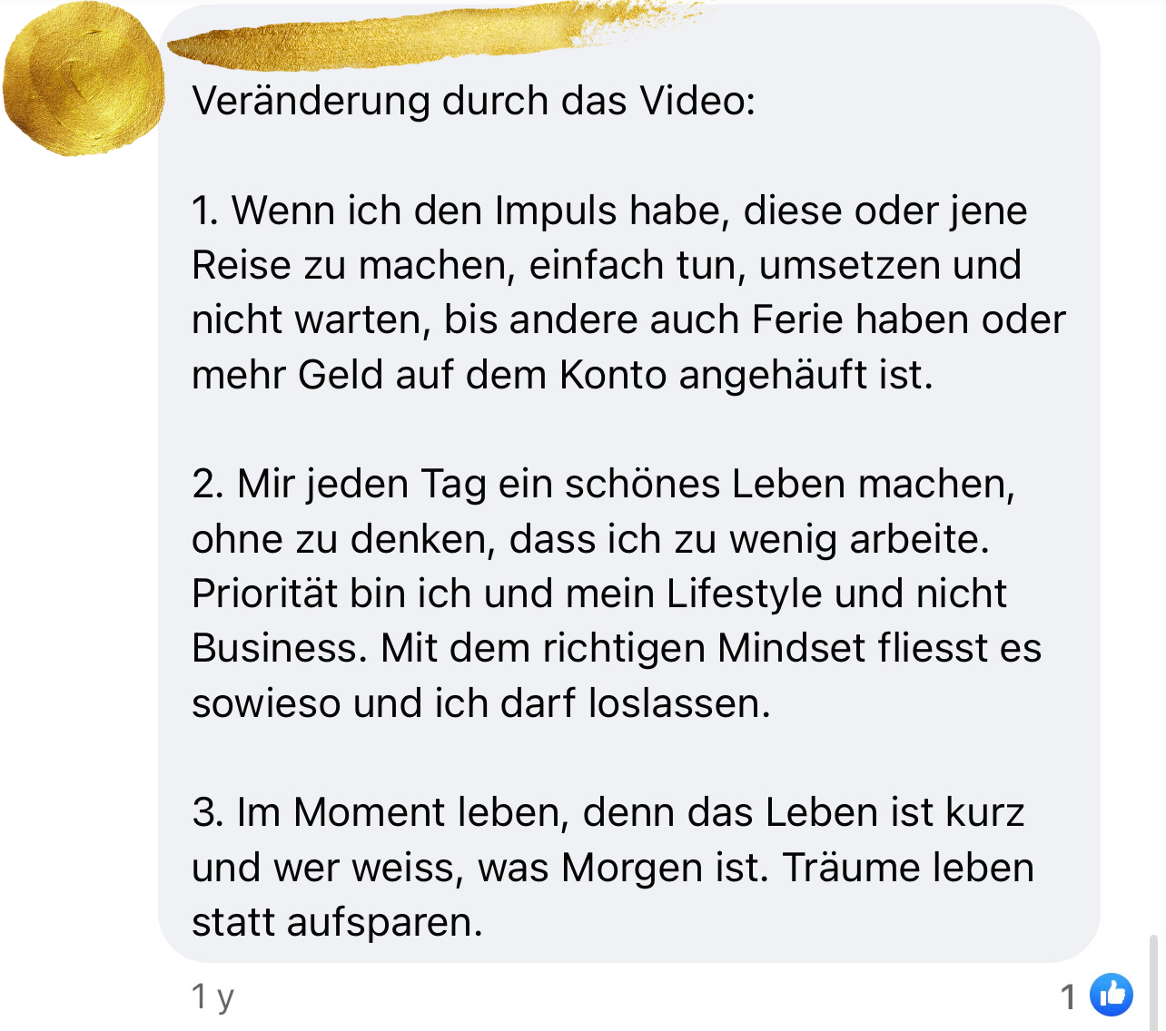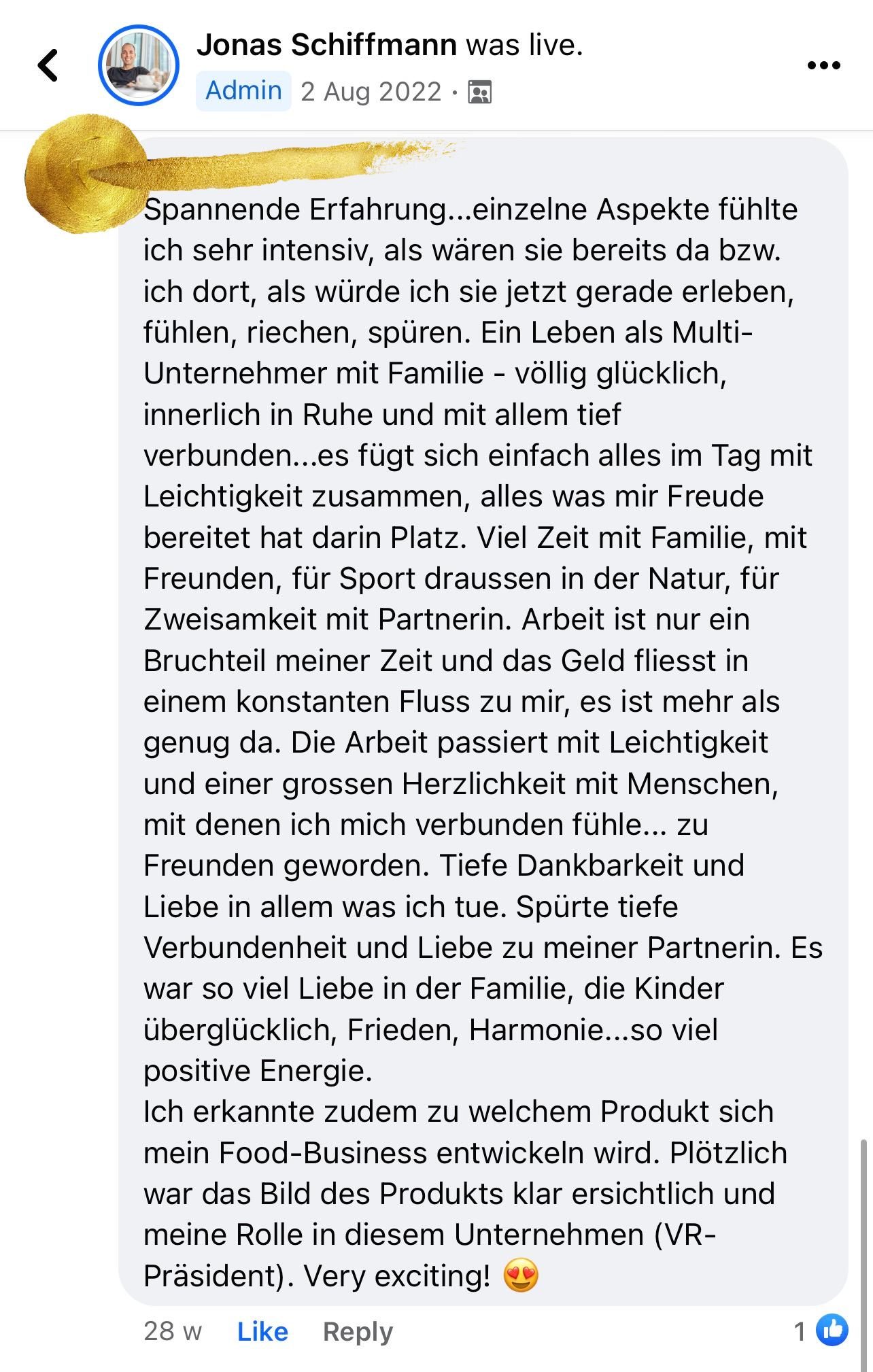 “Ich lebe auf einer tropischen Trauminsel, umgebe mich mit gleichgesinnten Herzensmenschen, erlebe Abenteuer und tiefe Verbundenheit. Ich habe mein eigenes ortsunabhängiges Business, einen Jet-Set-Lifestyle und mache coole Projekte mit Freunden. Ich date Traumfrauen und starte jeden Tag mit einem Lachen in den Tag.”